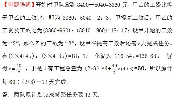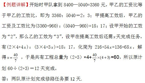例2、甲、乙两个工程队修路,最终按工作量分配8400元工资。按两队原计划的工作效率,乙队应获5040元。实际从第5天开始,甲队的工作效率提高了1倍,这样甲队最终可比原计划多获得960元。那么两队原计划完成修路任务要多少天?