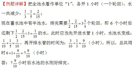 例3、蓄水池又一根进水管和一根排水管,单开进水管5小时灌满一池水,单开排水管3小时排完一池水,现蓄水池内有半池水,如果按照进水、排水;进水、排水……的顺序,各开1小时,多少小时后水池的水刚好排完?