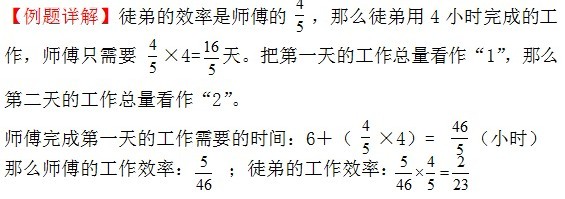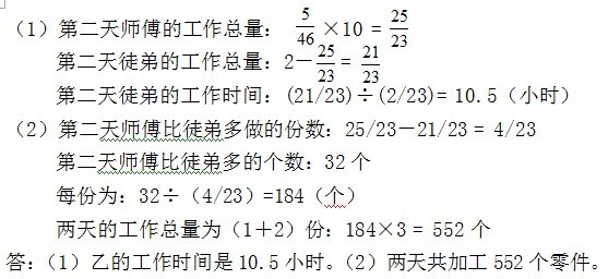 例4、一天,师徒二人接到一项加工零件的任务,先由师傅单独做6小时,剩下的由徒弟做,4小时作完,第二天,他们又接到一项任务,工作量是第一天的2倍,由师徒二人合作10小时,剩下的由徒弟做完,已知徒弟的工作效率是师傅的 4/5,师傅第二天比徒弟多做32个零件,问:(1)第二天徒弟做了多少小时?(2)师徒二人两天共加工多少零件?