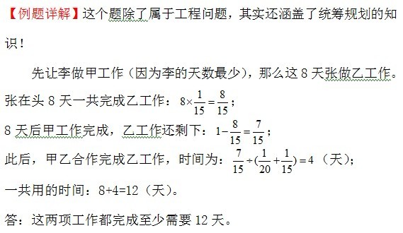 例5、有甲乙两项工作,张单独完成甲工作要10天,李单独完成乙工作要15天;李单独完成甲工作要8天,张单独完成乙工作要20天。如果每项工作都可以由2人合作,那么这两项工作都完成至少需要多少天?