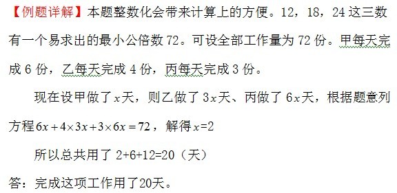 例6、一件工作,甲独做要12天,乙独做要18天,丙独做要24天。这件工作由甲先做了若干天,然后由乙接着做,乙做的天数是甲做的天数的3倍,再由丙接着做,丙做的天数是乙做的天数的2倍,终于做完了这件工作。问总共用了多少天?