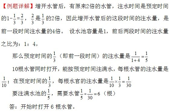 例7、有一些水管,它们每分钟注水量都相等。现在打开其中若干根水管,经过预定时间的1/3,再把打开的水管增加一倍,就能按预定时间注满水池;如果开始时就打开10根水管,中途不增开水管,也能按预定时间注满水池。问开始时打开了几根水管?