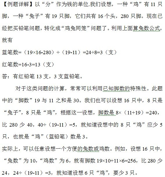 例1、红铅笔每支0.19元,蓝铅笔每支0.11元,两种铅笔共买了16支,花了2.80元,问红、蓝铅笔各买几支?