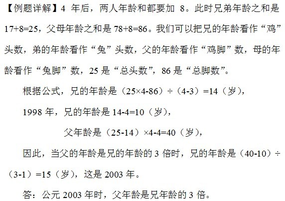 例3、今年是1998年,父母年龄(整数)和是78岁,兄弟的年龄和是17岁。四年后(2002年)父的年龄是弟的年龄的4倍,母的年龄是兄的年龄的3倍。那么当父的年龄是兄的年龄的3倍时,是公元哪一年?