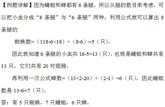 例4、蜘蛛有8条腿,蜻蜓有6条腿和2对翅膀,蝉有6条腿和1对翅膀。现在这三种小虫共18只,有118条腿和20对翅膀。每种小虫各几只?