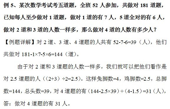 例5、某次数学考试考五道题,全班52人参加,共做对181道题,已知每人至少做对1道题,做对1道的有7人,5道全对的有6人,做对2道和3道的人数一样多,那么做对4道的人数有多少人?