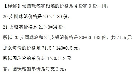 例1、圆珠笔和铅笔的价格比是4:3,20支圆珠笔和21支铅笔共用71.5元.问圆珠笔的单价是每支多少元?