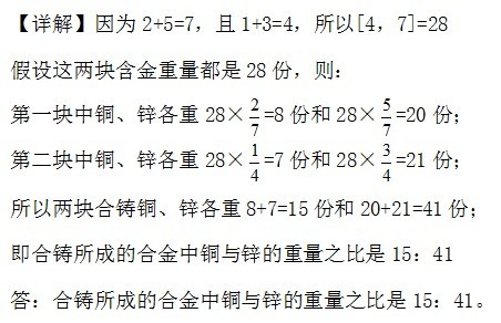 例2、有两块重量相同的铜锌合金.第一块合金中铜与锌的重量比是2:5,第二块合金中铜与锌的重量比是1:3。现在把这两块合金合铸成一块大的。求合铸所成的合金中铜与锌的重量之比。