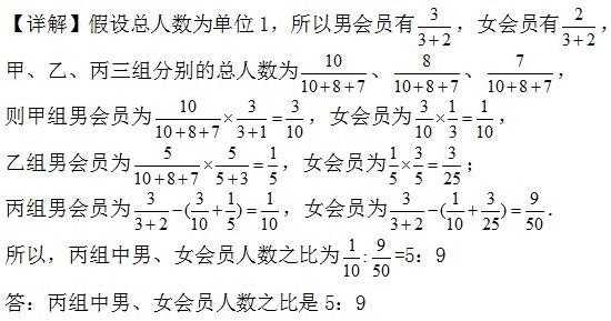 例3、某俱乐部男、女会员的人数之比是3∶2,分为甲、乙、丙三组。已知甲、乙、丙三组的人数比是10∶8∶7,甲组中男、女会员的人数之比是3∶1,乙组中男、女会员的人数之比是5∶3。求丙组中男、女会员人数之比。