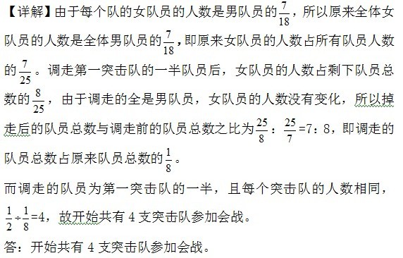 7/18,以后上级从第一突击队调走了该队的一半队员,而且全是男队员,于是工地上的全体女队员的人数是剩下的全体男队员的8/17,问开始共有多少支突击队参加会战?