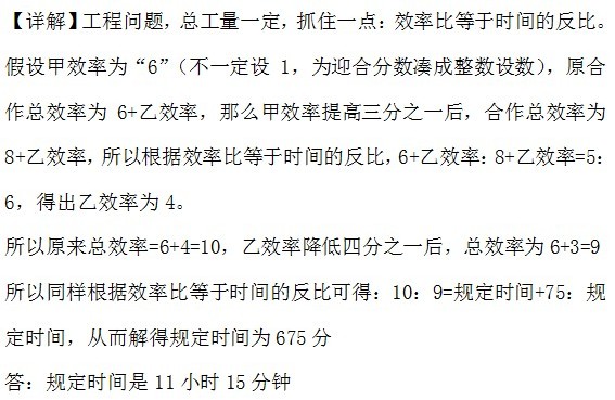 例5、一项工作由甲、乙两人合作,恰可在规定时间内完成,如果甲效率提高三分之一,则只需用规定时间的六分之五即可完成;如果乙效率降低四分之一,那么就要推迟75分钟才能完成,请问:规定时间是多少小时?