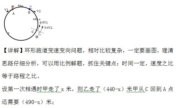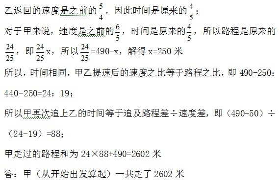 例6、在一个490米长的圆形跑道上,甲、乙两人从相距50米的A、B两地,相背出发,相遇后,乙返回,甲方向不变,继续前进,甲的速度提高五分之一,乙的速度提高四分之一.当乙回到B地时,甲刚好回到A地,此时他们都按现有速度与方向前进.请问:当甲再次追上乙时,甲(从开始出发算起)一共走了多少米?