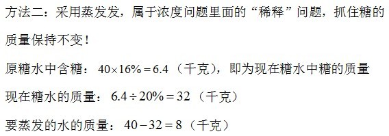 例1、现有浓度为16%的糖水40千克,要得到含盐20%的糖水,可才用什么方法?