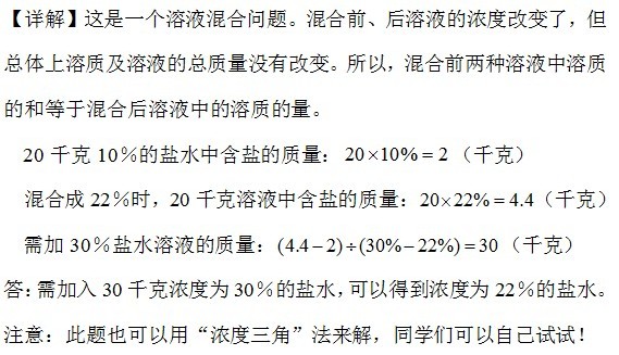 例2、现有浓度为10%的盐水20千克。再加入多少千克浓度为30%的盐水,可以得到浓度为22%的盐水?
