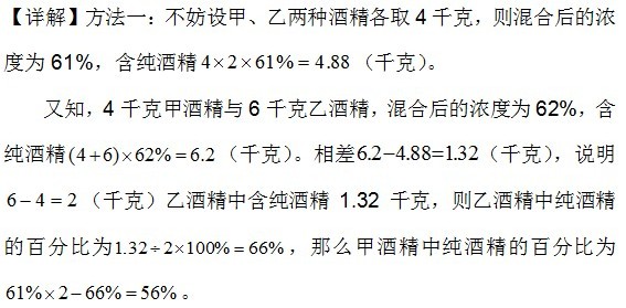 例3、甲种酒精4千克,乙种酒精6千克,混合成的酒精含纯酒精62%。如果甲种酒精和乙种酒精一样多,混合成的酒精含纯酒精61%。问:甲、乙两种酒精中含纯酒精的百分比各是多少?