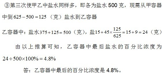 例4、甲容器有浓度为12%的盐水500克,乙容器有500克水。把甲中盐水的一半倒入乙中,混合后再把乙中现有盐水的一半倒入甲中,混合后又把甲中的一部分盐水倒入乙中,使甲乙两容器中的盐水同样多。求最后乙中盐水的百分比浓度。