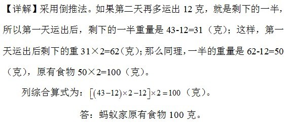 例1、一群蚂蚁搬家,原存一堆食物。第一天运出总数的一半少12克;第二天运出剩下的一半少12克,结果窝里还剩下43克。问蚂蚁家原有食物多少克?