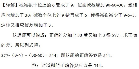 例2、哪吒是个小马虎,他在做一道减法题时,把被减数十位上的6错写成9,减数个位上的9错写成6,最后所得的差是577,那么这道题的正确答案应该是多少呢?