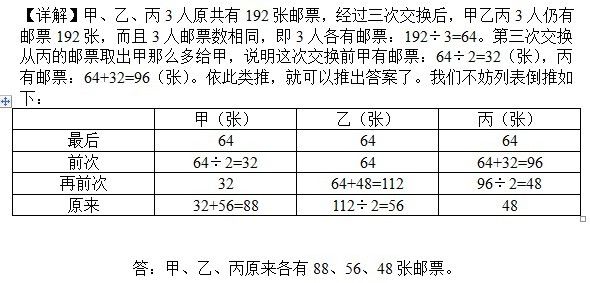 例1、甲、乙、丙3人共有192张邮票。从甲的邮票中取出乙那么多给乙后,再从乙的邮票中取出丙那么多给丙,最后从丙的邮票中取出甲那么多给甲,这时甲、乙、丙3人的邮票数相同。问:甲、乙、丙原来各有多少张邮票?