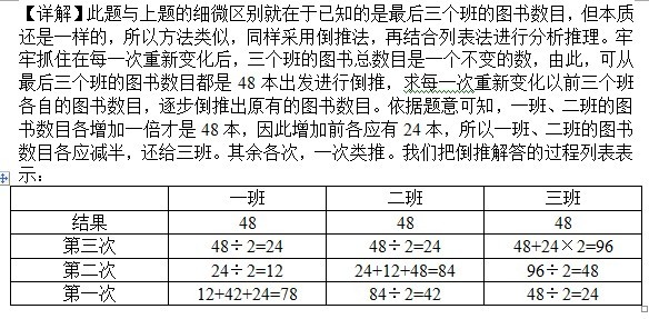 例2、一班、二班、三班各有不同数目的图书。如果一班拿出本班图书的一部分分给二班和三班,使这两个班的图书各增加一倍;然后二班也拿出一部分图书分给一班和三班,使这两个班的图书各增加一倍;接着三班也拿出一部分图书分给一班和二班,使这两个班的图书各增加一倍。这时,三个班的图书数目都是48本。求三个班原来各有图书多少本?