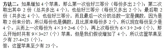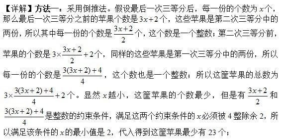 例4、有一筐苹果,把它们三等分后还剩两个苹果,取出其中两份,将它们三等分后还剩