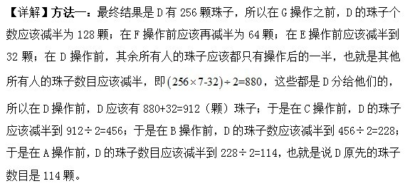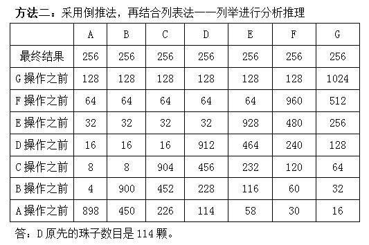 例5、A、B、C、D、E、F、G七个人都各有一些珠子。从A开始依序进行以下操作,每次都分给其他六个人与他们当时手中现有珠子数量一样多的珠子。当G操作后,每个人手中都恰好各有256颗珠子,请问D原先有多少颗珠子?