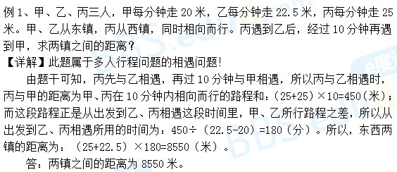 例1、甲、乙、丙三人,甲每分钟走20米,乙每分钟走22.5米,丙每分钟走25米。甲、乙从东镇,丙从西镇,同时相向而行。丙遇到乙后,经过10分钟再遇到甲,求两镇之间的距离?