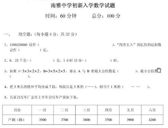 南雅中学小升初分班考试数学试卷 长沙奥数网编辑整理 2012-07-09 18:12:27 长沙奥数网编辑整理了南雅中学小升初分班考试数学试卷,希望对大家有所帮助! 点我下载查看完整试题 编辑推荐:【升学】:南雅中学小升初择校攻略 【真题】:南雅小升初真题及答案汇总