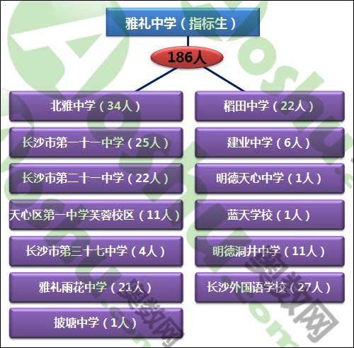据了解,2012年雅礼中学共有“直升生”134人,“指标生”186人。分别来自于长沙市内的十三所学校。其中“直升生”以南雅中学名额最多,其次是稻田中学以及北雅中学。总体人数比较平均。需要注意的是,像稻田中学这样的“对口支援”学校,直升生名额只针对通过微机派位进入受援中学学校,并且在受援中学学习蛮三年的同学。