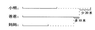 早晨小明和爸爸、妈妈一起跑步。爸爸跑的路程比小明的2倍少2O米,比妈妈的2倍多10米。小明和他妈妈谁跑的路程长些?()
