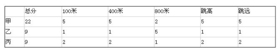 由题中条件可知:乙800米赛跑得第一名,乙得5分;而甲总分是22,只有当他取得五项中的四项第一名、另一项为第二名时,才会得22分,很显然,甲 只能是800米得第二名,其余四项均为第一名;由于参加比赛的只有三人,每人每项至少能得第三名,拿1分;乙只有除8OO米外四项都得第三名,才会获得9 分(5+l+1+1+1);那么剩下的名次皆为丙的,即丙除800米得第三名外,其余四项都得第二名。如下表所示: