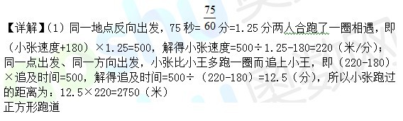 例、小张和小王各以一定速度,在周长为500米的环形跑道上跑步,小王的速度是180米/分。(1)小张和小王同时从同一地点出发反向跑步,75秒后两人第一次相遇,小张的速度是多少米/分?