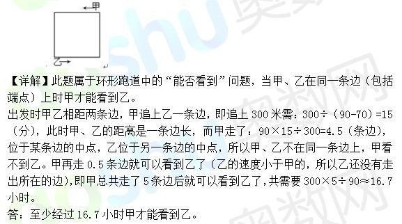 例1、如图所示,沿着某单位围墙外面的小路形成一个边长300米的正方形,甲、乙两人分别从两个对角处沿逆时针方向同时出发。已知甲每分走90米,乙每分走70米。问:至少经过多长时间甲才能看到乙?(3月27日天天练)