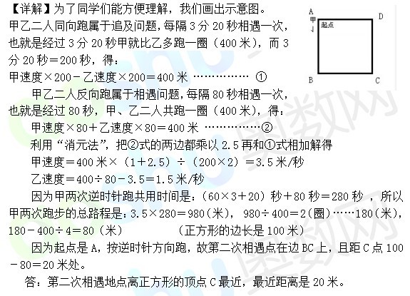 例2、甲、乙两人在周长400米正方形跑道上匀速跑步,假设正方形的四个顶点A、B、C、D的顺序依逆时针方向排列,起点是A,甲比乙快,二人同向跑每隔3分20秒相遇一次,反向跑每隔80秒相遇一次。如果甲、乙二人先同向跑(逆时针)相遇一次,紧接着反向跑(甲方向不变,乙按顺时针方向)相遇一次。甲乙二人第二次相遇地点离正方形的四个顶点 A、B、C、D的哪一点最近?最近距离是多少?