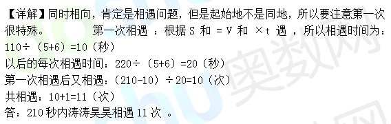 例1、在周长为 220 米的圆形跑道的一条直径的两端,涛涛、昊昊二人骑自行车分别以6米/秒和5 米/秒的速度同时、相向出发(即一个顺时针,一个逆时针),沿跑道行驶,则 210秒内涛涛昊昊相遇几次?(3月28日天天练)