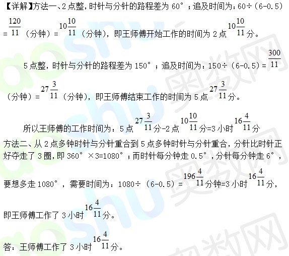 例2、王师傅2点多钟开始工作时,时针与分针正好重合在一起;5点多钟完工时,时针与分针正好又重合在一起。问:王师傅工作了多长时间?(4月6号天天练)