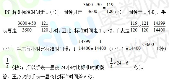 例、王叔叔有一只手表,他发现手表比家里的闹钟每小时快 30 秒;而闹钟却比标准时间每小时慢 30 秒,那么王叔叔的手表一昼夜比标准时间差多少秒?(4月9号天天练)