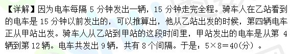 例1、(第一届华罗庚金杯初赛试题)有一路电车的起点站和终点站分别是甲站和乙站。每隔5分钟有一辆电车从甲站出发开往乙站,全程要走15分钟。有一个人从乙站出发沿电车路线骑车前往甲站。他出发的时候,恰好有一辆电车到达乙站。在路上他又遇到了10辆迎面开来的电车,才到达甲站。这时候,恰好又有一辆电车从甲站开出。问他从乙站到甲站用了多少分钟?