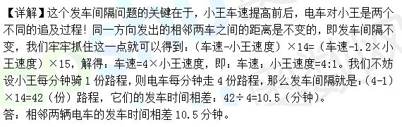 例2、电车车站每隔固定的时间发出一辆电车。小王骑自行车每隔14分钟就被一辆后面开来的电车追上;如果小王把车速提高20%,则每隔15分钟就被一辆后面开来的电车追上。那么相邻两辆电车的发车时间相差多少分钟?(5月24号天天练)