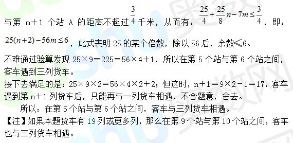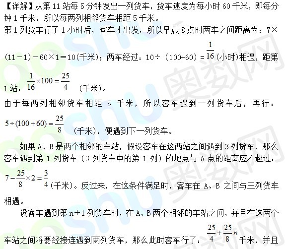 例4、(第三届华杯赛决赛二试试题)一条双向铁路上有11个车站,相邻两站都相距7千米。从早晨7点开始,有18列货车由第11站顺次发出,每隔5分钟发出一列,都驶向第1站,速度都是每小时60千米。早晨8点,由第1站发出一列客车,向第11站驶去,时速是100千米。在到达终点站前,货车与客车都不停靠任何一站。问:在哪两个相邻站之间,客车能与3列货车先后相遇?(5月28号天天练)