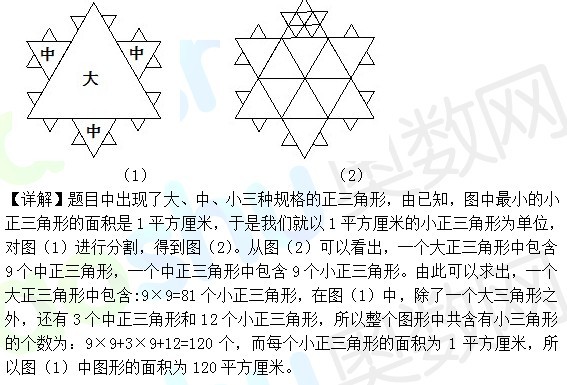 例2、把正三角形的每条边三等分,以各边的中间一段为边向外作小正三角形,得到一个六角形。再将这个六角形的六个“角”(即小正三角形)的两边三等分,又以它的中间段为边向外作更小的小正三角形,这样就得到如下图(1)所示的图形。如果所作的最小的小正三角形的面积为1平方厘米,求如图中整个图形的面积。(六年级7月9日天天练)