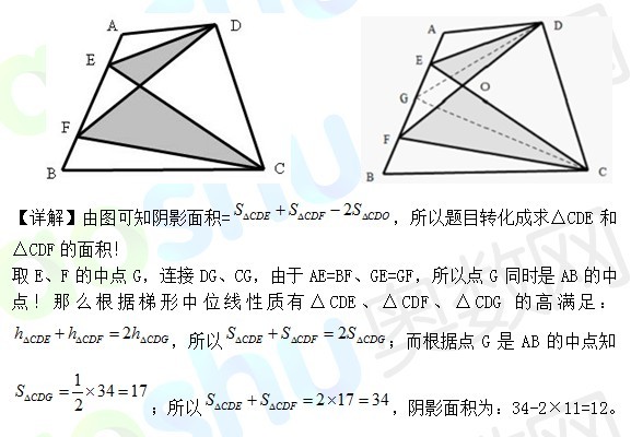 例4、如图梯形ABCD的面积为34,三角形CDO的面积为11,其中AE=BF,求图中阴影部分面积。