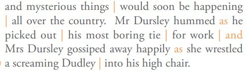 我教过一个优秀生,小学六年级,曾把我讲读的《哈利波特与魔法石》认真学过三遍。孩子在小升初的暑假,开始独立阅读 Roald Dahl 的《查理的巧克力工厂(Charlie and the Chocolate Factory)》,孩子可以像下面这样,按照意群,读懂一个有 66 字之多的英文长句: