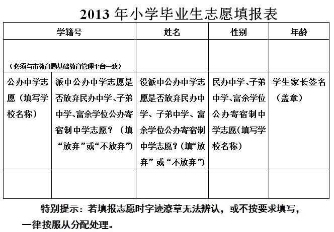 1、城区所有小学毕业生除提前录取的外,必须在所属小学对应的公办中学中选择一所填报志愿(回原籍读初中的小学毕业生也要参加微机派位,不影响回原籍就读)。需要择校的小学毕业生,可再任选一所民办中学或子弟中学或富余学位公办寄宿制中学(以下简称民办学校)填报志愿。