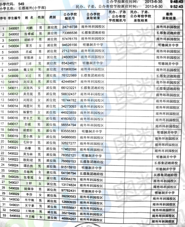 2013年长郡雨外小学部小升初微机派位录取结果(2)