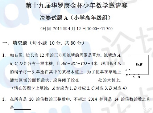 下载试卷请点击>>2014年第十九届华杯赛决赛(小高组)A卷