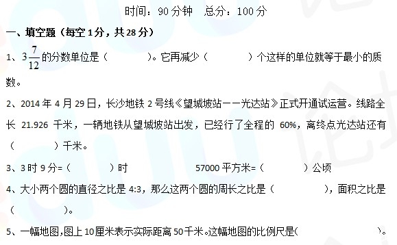 下载试卷>>2014.5.10长郡小升初考试数学试卷.doc
