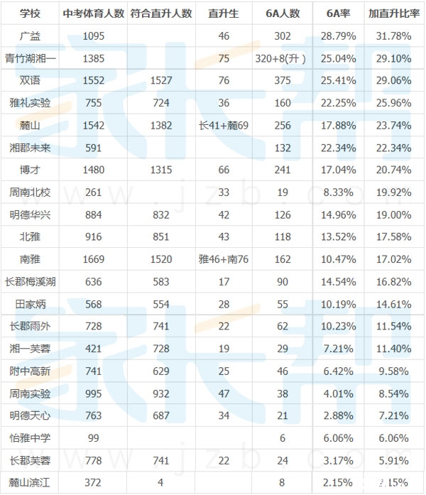 2015年长沙中考人数为有初中毕业生35767人,除对口直升生1043人外,共有34724人参考,今年6A以上共有2354人,5A1B的有4698人。可以看出,七小名校的优势已经进一步被削弱,各个初中进一步发展起来。