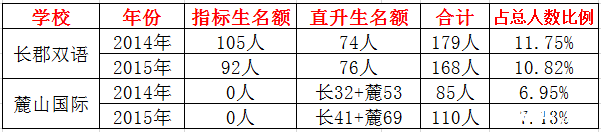 麓山国际2014年因为是民办转公办的最后一年,没有指标生名额。2015年正式公办后,因为在麓山自己的高中部也有直升生名额,所以仍然没有指标生名额。直升生名额方面,麓山在麓山高中部和长郡都有指标。整体对比二者升入高中的优惠政策,双语的占比人数会更多。