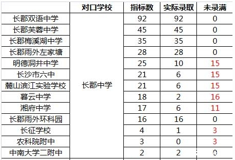 以长郡中学的指标生录取情况为例,最低录取控制线在4A2B,未录满(标红数字为未录满名额)说明初中学校中考成绩达到4A2B的人数低于指标生计划人数。指标生实际录取情况与指标生计划差距越大(未录满的人数越多),证明这个学校的成绩越不好。